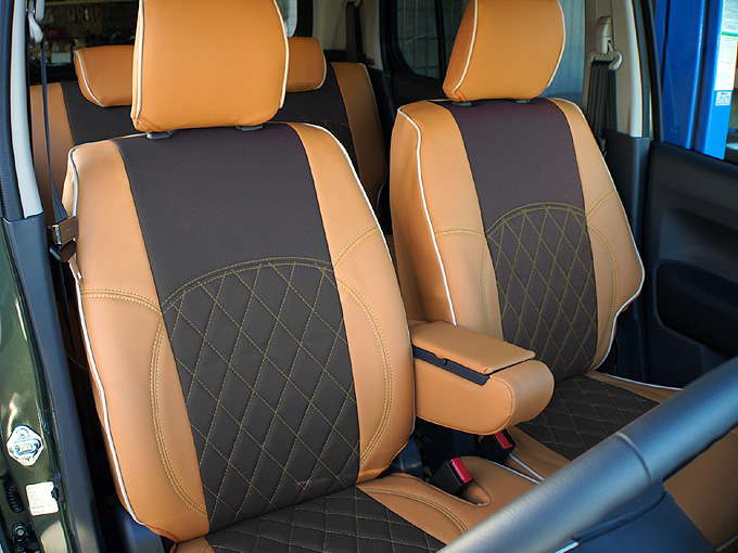 3パターンのデザインと13色のレザーカラー。10色のステッチ、11色のパイピングと55000通りの組み合わせから好みのコーディネートを選べるイージーオーダーシートカバー。